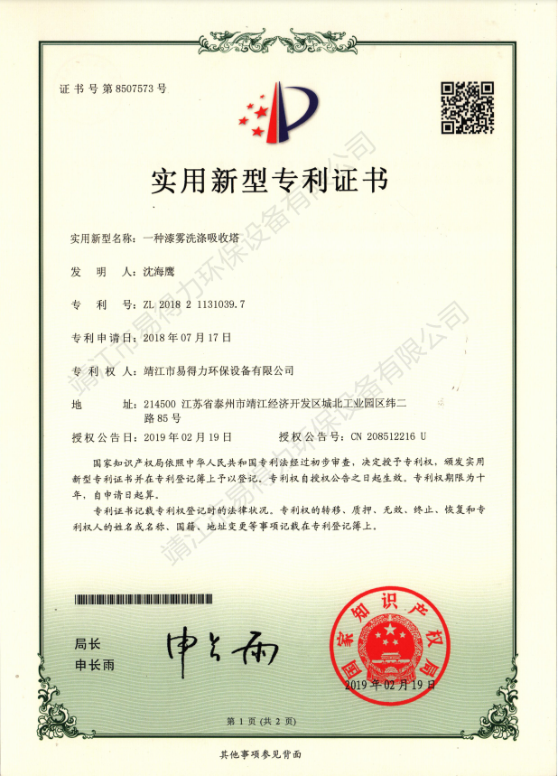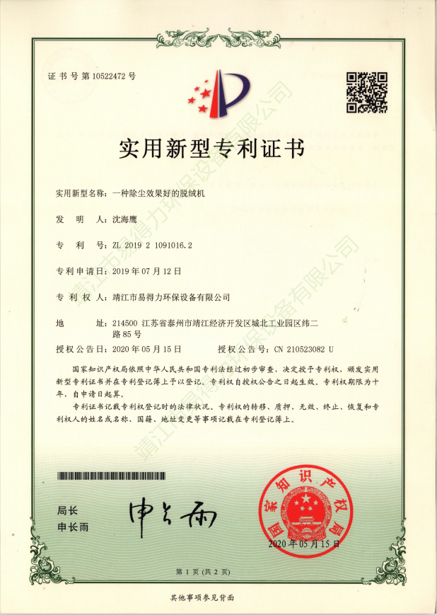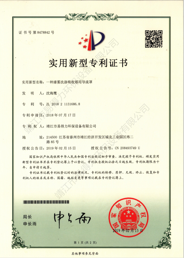 專利證書本公司坐落于開放開發(fā)超前城市江蘇靖江,我們精良優(yōu)秀設(shè)計團(tuán)隊始終遵循著創(chuàng)新超越的理念,贏得了中外合資企業(yè)的信賴。易得力環(huán)保設(shè)備有限公司與上海環(huán)科院等科研單位保持合作關(guān)系,不斷加大自身的科研力量,集中了一批國內(nèi)環(huán)境科技研究和應(yīng)用方面的高素質(zhì)人才,取得多項實用新型專利證書。…… 查看更多 >>